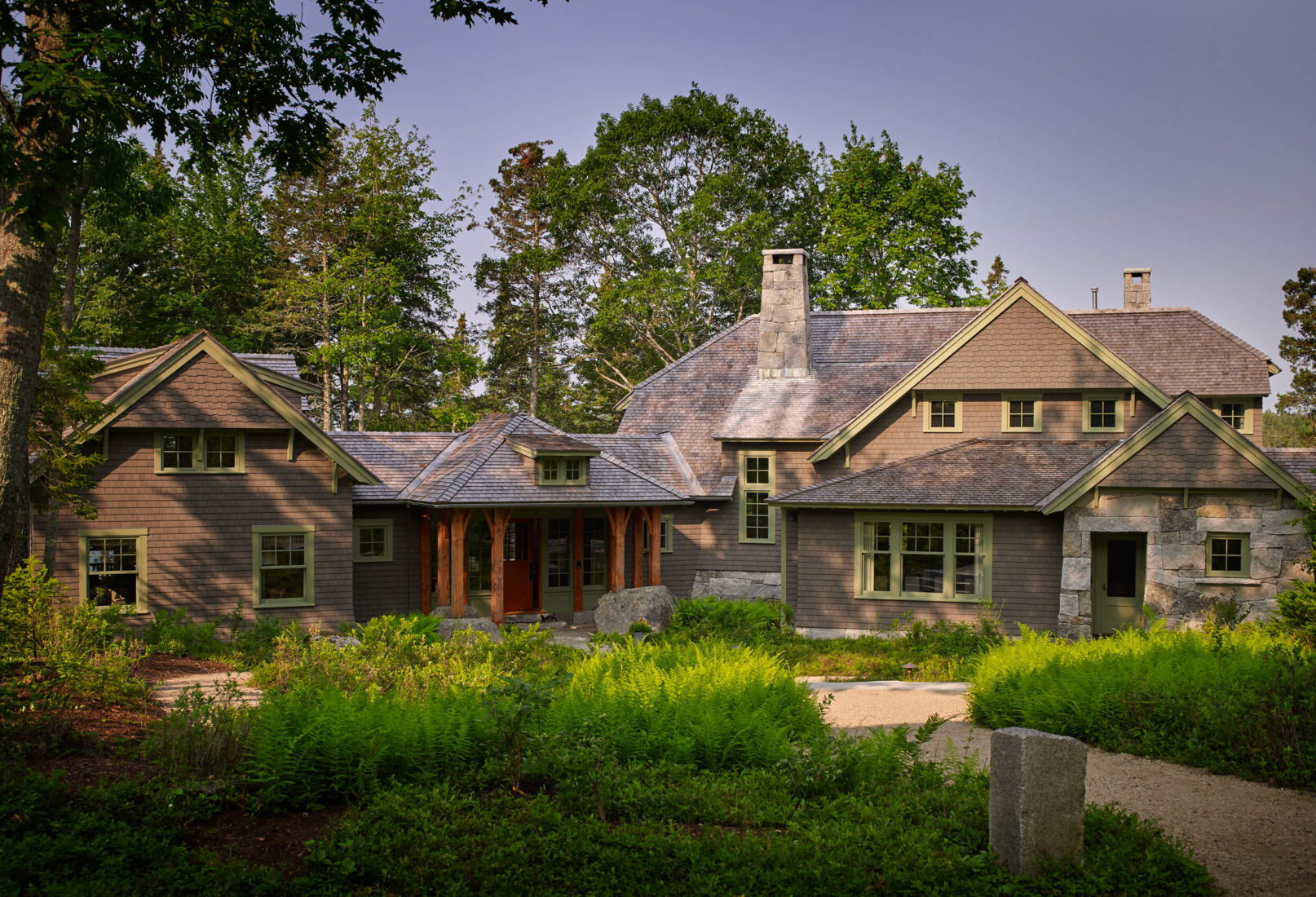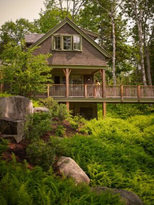 By nestling organically into the topography, this 5,600 square foot residence achieves a humble and harmonious presence within its environment. Granite from the site was used in its construction, contributing to countertops, chimneys, flooring, steps, showers, paving, stone walls, and columns; the stone on which the chimney rests had to be put in place before the walls could be built due to its massive size. The robust Douglas fir framing in the living room is mortise and tenon joined and bound with hand-forged iron bands. Solar panels generate enough energy to run geothermal heat pumps for effectively free heating and cooling. Inclusive of the guest cottage, barn, boathouse, and two ravine-spanning bridges, this project received an American Society of Landscape Award in 2015.