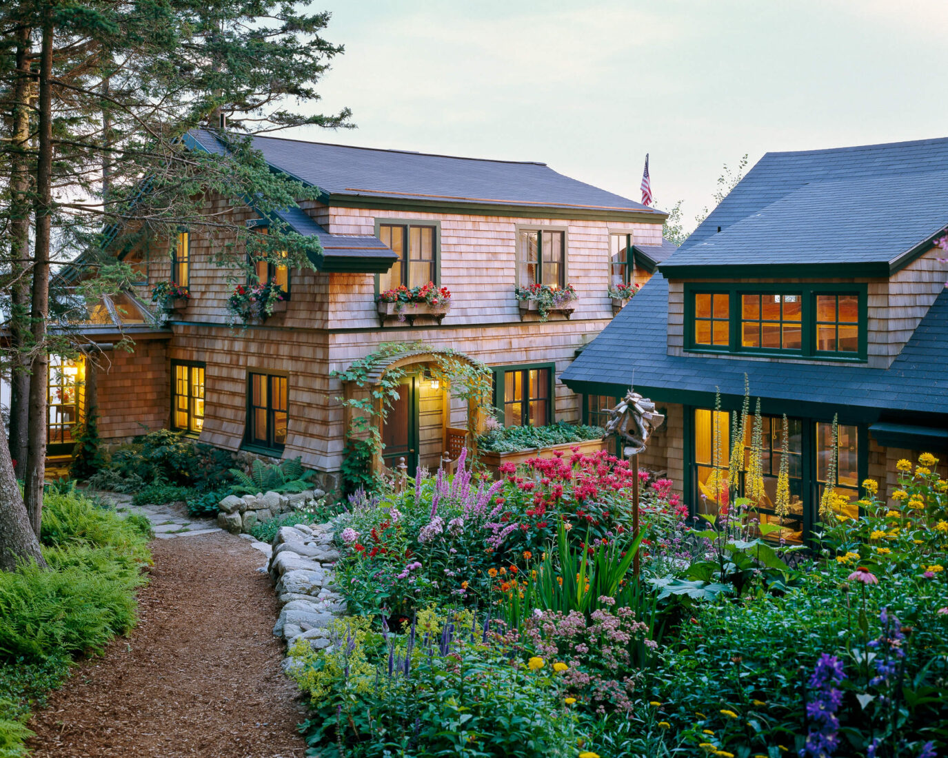 Originally a bland 1960s “box” situated just a few feet from the ocean’s edge, we enlarged this coastal cottage and renovated it into a richly textured and detailed craftsman-inspired home. All three buildings are carefully situated together—but apart to afford privacy. The design makes the most of the sweeping views—welcoming the sun and the shoreline—while keeping the grouping asymmetrical and rustic. The design works around the terrain, and embracing the natural beauty of its surroundings, with connecting pathways to ebullient flower gardens.